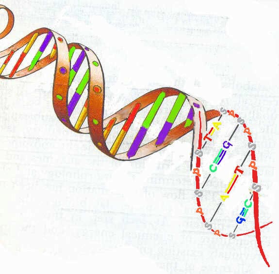 The next drawing gives a schematic view of the structure of the double helix. It illustrates that the back bone of the strings consist of phosphate (P) and sugars (S). The sugar is deoxyribose. ( The ordinary sugar we all know is cane sugar and constist of two glucose molecules)