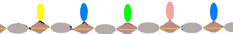 This drawing shows two RNA strings. They are single strings ( not the double heix or double strings of DNA). The suger deoxy-ribose is replaced with another sugar ribose.(indicated with a yellow stripe on the sugar icon) Uracil(pink) replaced thymine (red) as one the bases in RNA .